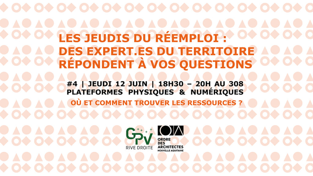 Le GPV Rive Droite et l’Ordre des Architectes de Nouvelle-Aquitaine ont le plaisir de vous convier à la 4ème rencontre des « Jeudis du réemploi« , organisée au 308 avenue Thiers à Bordeaux :